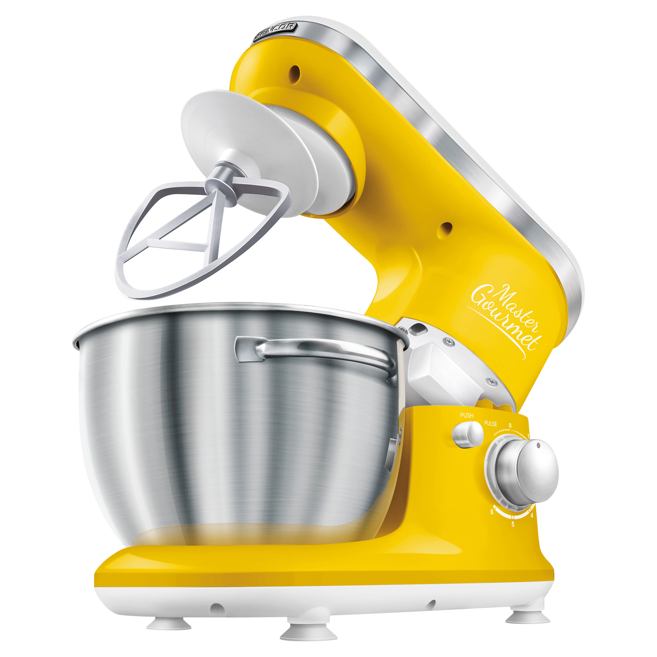 4 accessori intercambiabili: gancio per impastare (per impasti lievitati pesanti e duri), frusta di miscelazione a forma di A (per creme e impasti leggeri senza lievito), frusta rotonda (per montare panna, albumi d'uovo, ecc.), coperchio versatore