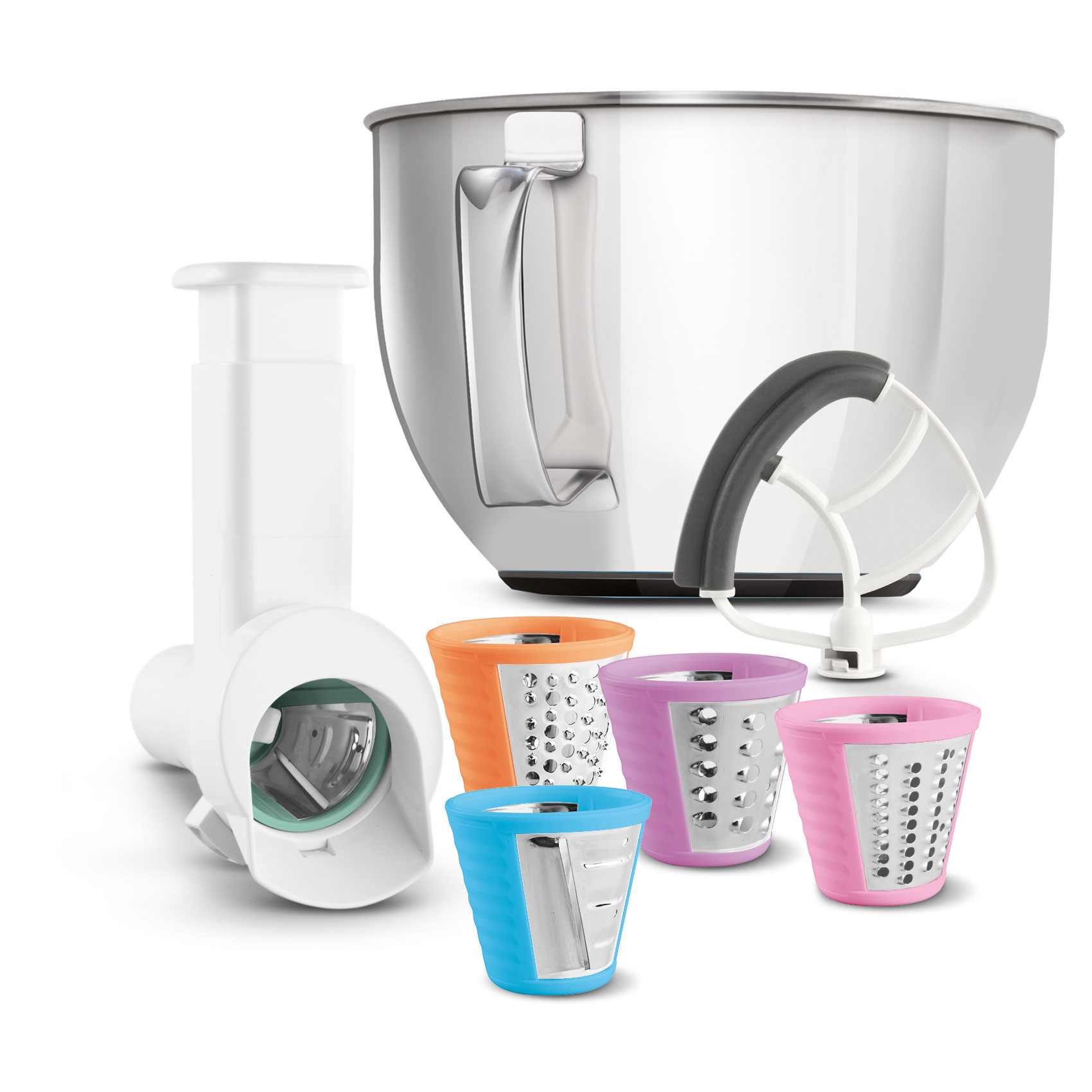- Affettatore e grattugia, sbattitore Flexi, ciotola in acciaio inossidabile da 4,5 litri con manico